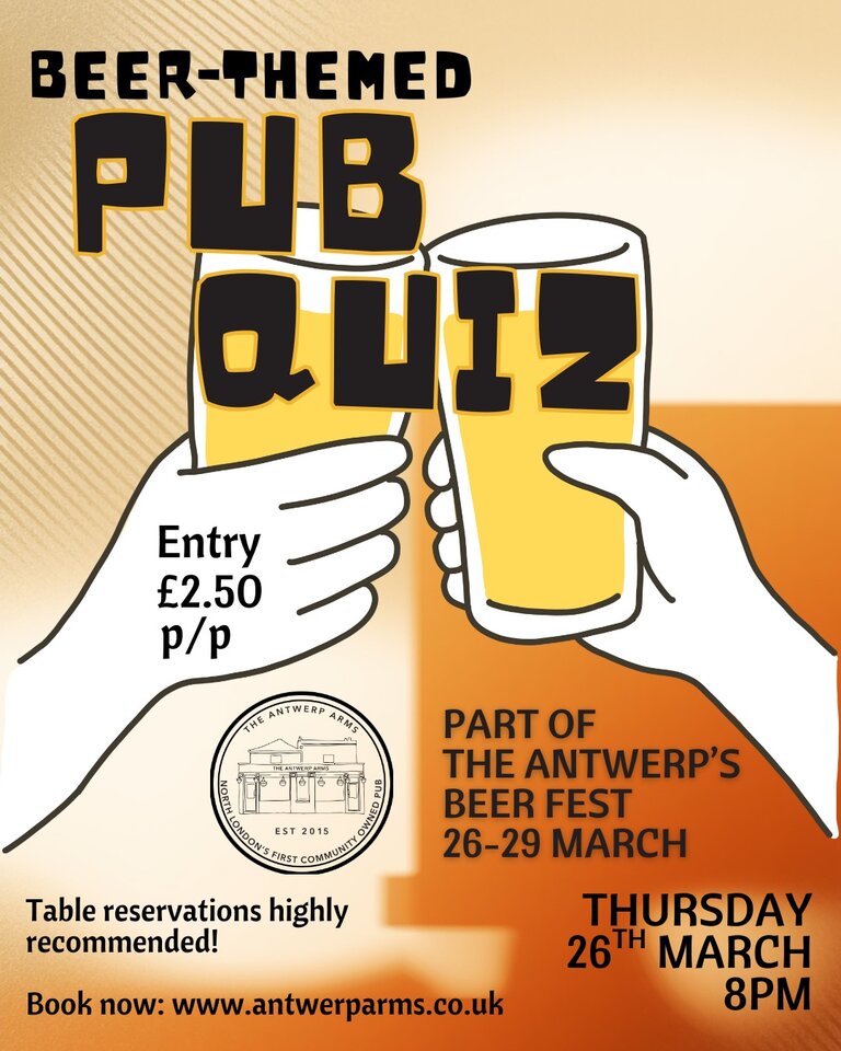 Antwerp Arms Beer Themed Pub Quiz Antwerp Arms Friday 27 March 2026 20:00 : Antwerp Arms, 168-170 Church Road, Tottenham, N17 8AS